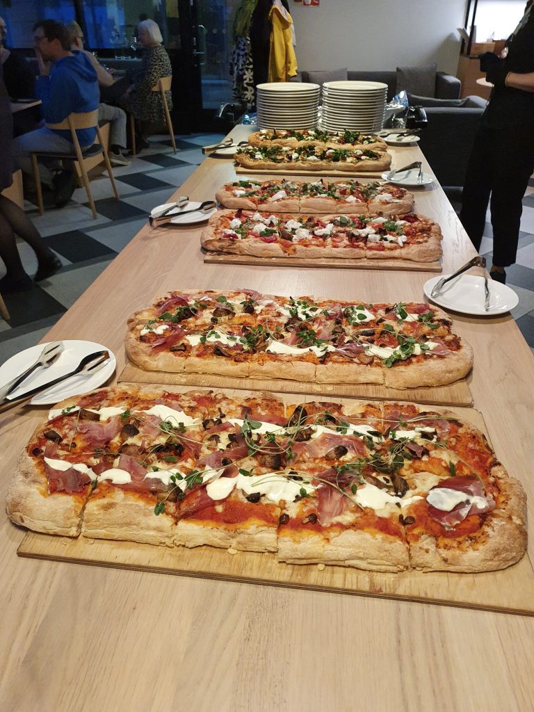 Nautimme rennossa tilaisuudessa 33 hengen voimin pizzaa ja viinejä: kahta punaviiniä, valkoviiniä sekä kuohuviiniä.